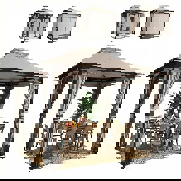 Designed to make outdoor living feel more considered, the Outsunny 3 x 3.6 m Outdoor Garden Gazebo creates a comfortable, sheltered spot for relaxed evenings and easy-going gatherings. A double-tier roof with colour-blocking detail adds a decorative finish while encouraging airflow, with integrated netting to help keep unwanted guests outside. Soft curtains and breathable mesh panels let you move from open and airy to a more private setting whenever you choose.