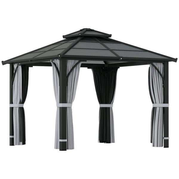 Create a comfortable outdoor shelter with the Outsunny 3 x 3(m) hardtop gazebo, designed for patios and garden seating areas. The roof is made with 7mm thick polycarbonate panels that are UV and water resistant, helping to provide cover in changeable weather. A two-tier roof design encourages airflow, supporting a cooler feel beneath the canopy during warmer days.
