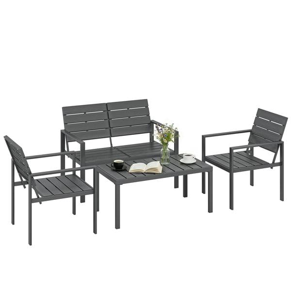 Tired of outdoor garden furniture that fades or feels fragile? This Outsunny balcony furniture set includes a loveseat, two armchairs and a coffee table. All-weather HDPE construction resists water, cracks or rot. Slatted design keeps you cool and allows water or spills to drain quickly. A spacious coffee table is roomy for snacks, drinks or family time. Easy to assemble, this wood-effect conservatory furniture set creates a welcoming nook for relaxing, chatting or enjoying with friends.