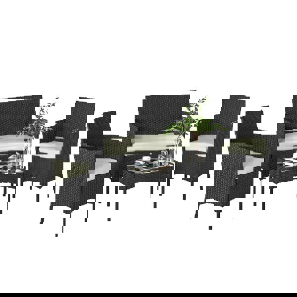 Transform your outdoor space with the rattan garden furniture set from Outsunny. This four-piece outdoor patio set, featuring two armchairs, a loveseat and a coffee table, offers versatile layout options for any outdoor area. Wrapped in UV-resistant woven PE rattan with soft seat cushions and a sleek glass-topped table, this rattan garden set the great setup for relaxation and social gatherings.