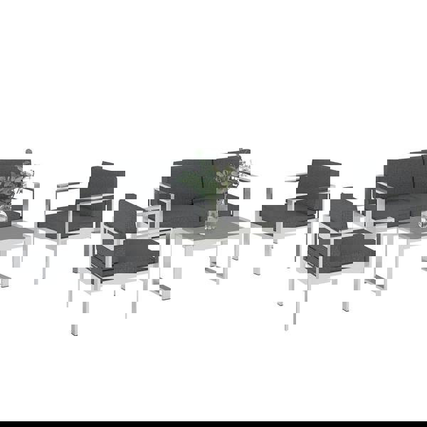 This four-piece set includes a loveseat, two armchairs and a coffee table, allowing you to arrange the layout to suit your space. A brushed aluminium frame keeps the look clean and modern, while the wood plastic composite slatted tabletop adds a practical finishing touch. Cushion covers in 200 GSM Olefin are designed to be more resistant to UV, fading, water and tearing, and the zipped covers can be removed for washing when needed.