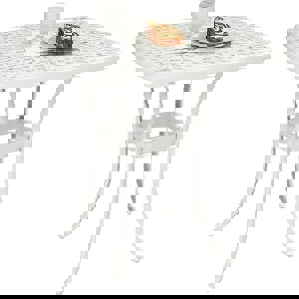 Sophisticated style for the garden - this Outsunny patio coffee table. Made from cast aluminium, this is a strong, solid piece which is suitable for outdoor use. A floral cut-out table top gives it a decorative feel, with the white-coloured finish bringing beauty. It features a 38mm centre hole to hold a parasol umbrella - keep shaded as you sit and relax when the sun is out.