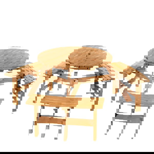● Colour: Brownish Red ● Material: Fir Wood ● Overall Dimension: Ф178 x 70H cm ● Table Size: Ф90 x 70H cm ● Bench Size: 80L x 25W x 42H cm ● Parasol Hole Diameter: 5 cm ● Weight Capacity: 227 kg (bench), 50 kg (table) ● Item Label: 84B-163