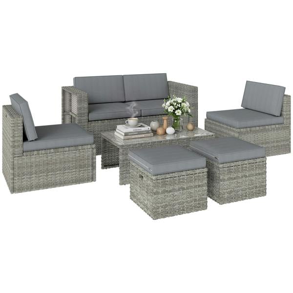 Designed for easy outdoor living, the Outsunny 6 Piece Rattan Garden Furniture Set brings a relaxed, considered look to patios and gardens. This nesting conversation set is made to keep your space feeling open, with a space-saving design that stores neatly when not in use.