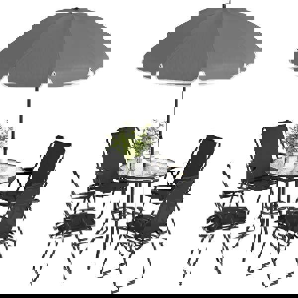 Simple, stylish outdoor garden furniture for relaxing or dining with this Outsunny patio table and chairs set. The balcony furniture set comes with a round table and four folding chairs: plenty of room for you and company. The powder coated steel frames mean the outdoor table and chairs are strong and robust. Folding chairs feature breathable texteline seats for cool comfort. This outdoor dining table and chairs are complete with a Φ180 cm parasol to shade and protect you.
