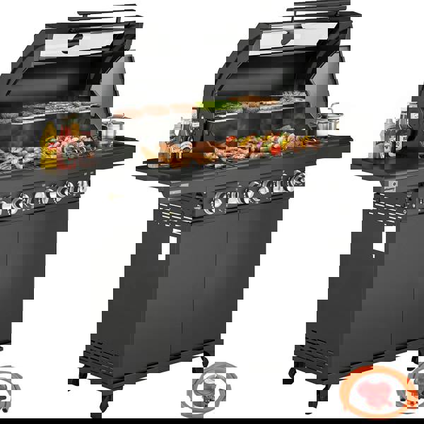 Independent burners with individual piezo ignition give you direct control over heat, and the lid helps retain flavour as you cook. Progress is easy to track thanks to the built-in thermometer and viewing window. For day-to-day convenience, two side tables and a cabinet keep essentials close to hand, while a removable grease box supports simpler clean-up. Four universal wheels make it easy to move into position, with brakes for stable standing.