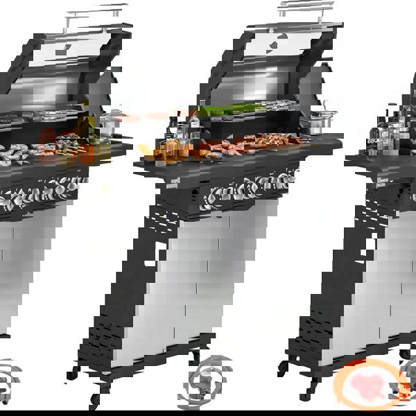 Close the lid to help lock in flavour, then keep an eye on progress through the glass window and built-in thermometer. Two side tables and a cabinet offer practical storage for BBQ essentials, and a removable grease box supports easier clean-up. Finished with four universal wheels and brakes, it’s simple to move into position and keep steady once in place.