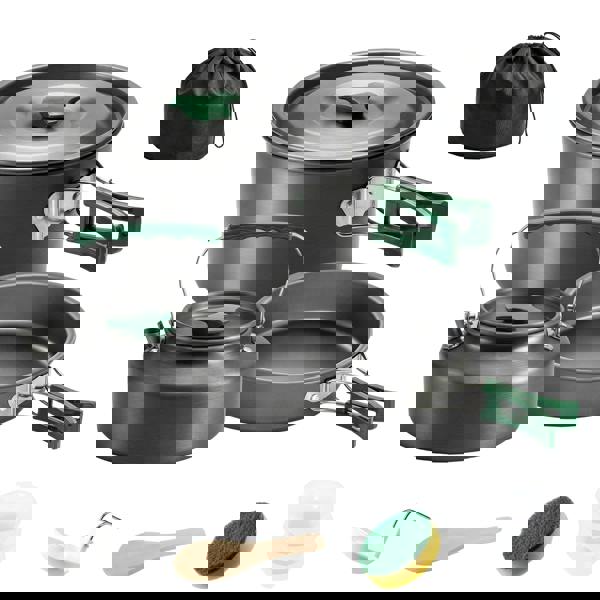With 11 pieces in the set, it’s sized to serve 2–3 people, making it a practical choice for shared camping trips. High-conductivity aluminium is designed to boil water in under 5 minutes, while heat-resistant plastic handles offer a more secure grip when moving hot cookware. A non-stick coating supports quicker clean-up when water is limited, and the set requires no assembly.
