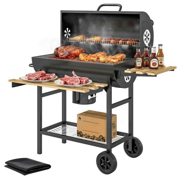 Foldable side tables, a front shelf and a bottom shelf create a more organised prep area, keeping essentials close to hand without taking over your patio. When it’s time to pack away, the folding shelves help save space, and two wheels make it easier to move into position. A removable ash pan with a handle supports quicker clean-up after use, and a protective cover helps shield the grill from dust, rain and outdoor elements.