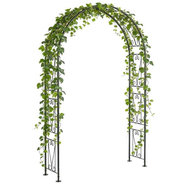 Made from metal with a powder-coated finish, the frame is built for outdoor placement, offering rust and weather resistance. Base plates and ground stakes are included to help keep the arch stable once positioned, while the weight capacity supports up to 10 kg on each side and 5 kg on the top.