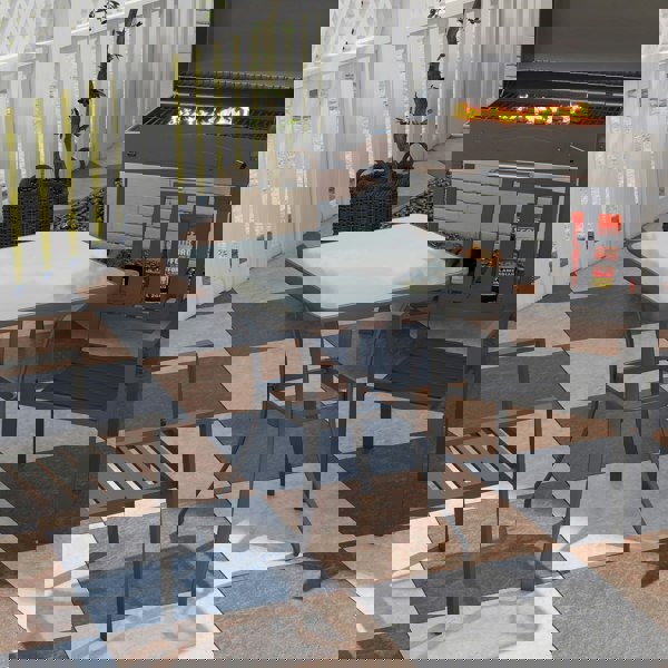 This square outdoor small table made using a metal structure and Glass top. The dinner table's glass top is easy to clean, and the whole unit is lightweight to make it easy to move around if required. It can be used both for indoor and outdoor, and is easy to keep clean and maintain.
