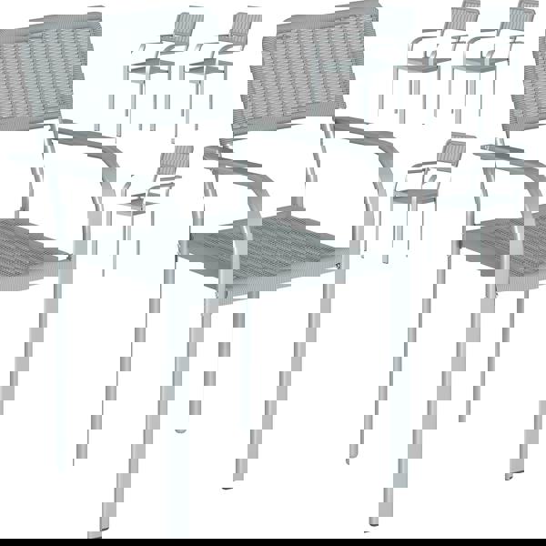 Each chair pairs a plastic seat with a steel frame to support everyday use outdoors. Armrests and a breathable backrest help keep seating comfortable, while the stackable design makes it simple to clear the space when you are finished entertaining.