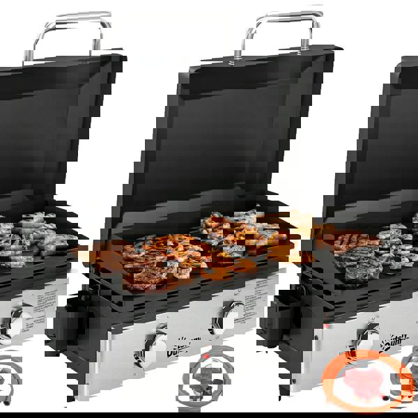Designed for compact outdoor cooking, the Outsunny Grill Griddle is a tabletop Gas BBQ that brings a practical setup to back gardens and camping trips alike. Finished in black and made from metal and stainless steel, it’s built to handle high-heat grilling, with heat resistance up to 600℃.