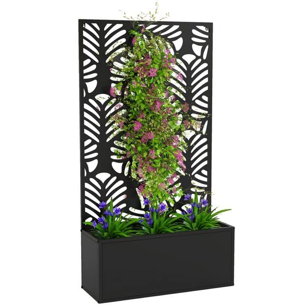 Bring structure to patios, balconies and garden corners with the Metal Raised Garden Bed with Trellis from Outsunny. Designed with a decorative monstera leaves cut-out trellis, it offers space for climbing vines while keeping your planting neatly contained below. The raised planter provides room for a mix of plants, flowers and vegetables, making it a practical choice for compact outdoor areas where you want greenery to grow upwards as well as outwards.