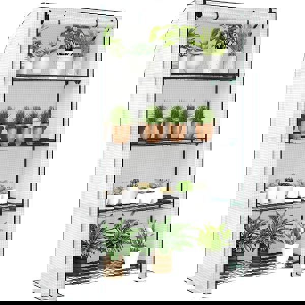 A steel frame creates a strong, freestanding structure, paired with four movable wire shelves so you can arrange greenery across multiple levels. The three-layer polyethylene cover is UV-resistant and features an inner mesh to help prevent tears, with hemmed edging for added reinforcement. A roll-up, zipped door makes access simple and allows ventilation when needed, while overlong corner edges can be buried into soil for extra stability.