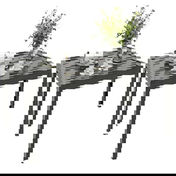 The rectangular slatted tabletop is both attractive and functional, helping to prevent water build-up and allowing the surface to dry quickly. A galvanised steel frame with a powder-coated finish provides a sturdy foundation, while adjustable foot pads help keep the table stable on uneven ground. Suitable for patios, balconies, terraces and gardens, it is an easy way to make relaxed outdoor moments feel more organised.