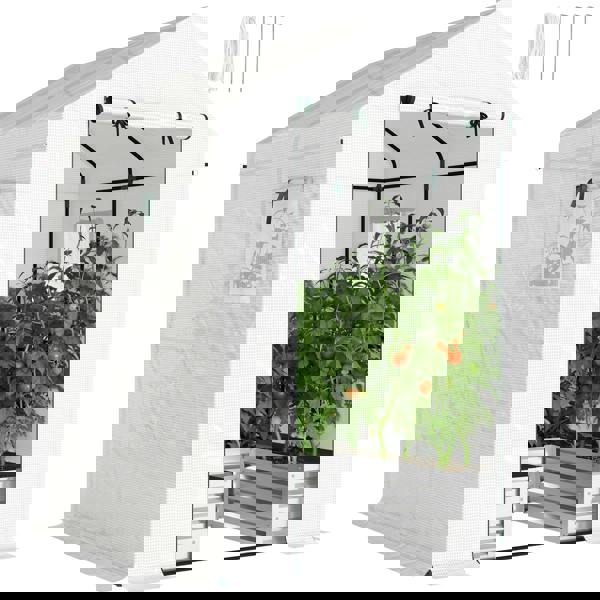 A roll-up door and windows make it easy to ventilate and access your plants, helping you manage the internal environment as needed. The open-bottom design supports natural root growth and encourages efficient water drainage. Finished in white, it’s built with a steel frame and a 135 gsm PE cover that is both waterproof and UV-resistant, with guy ropes and ground stakes included to enhance stability outdoors.