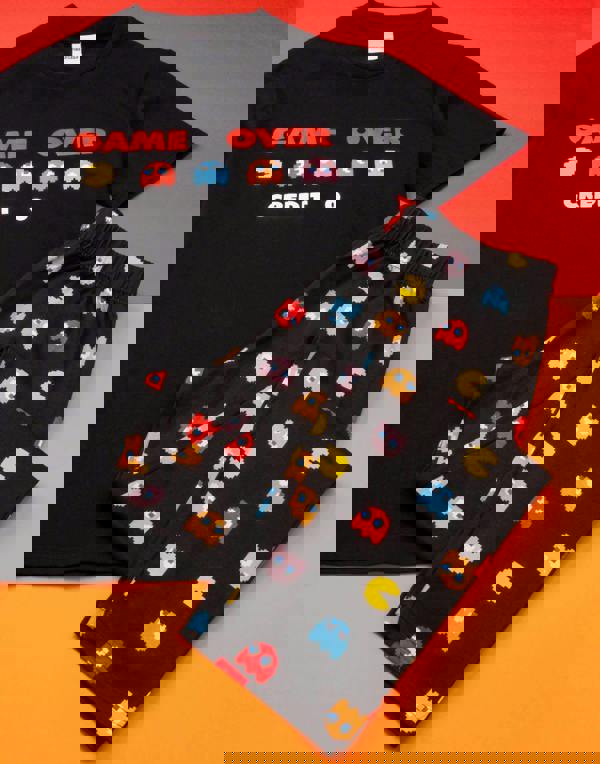 Ideal for wearing at bedtime and relaxing around the house whilst gaming, the adult Pac Man pjs set comes with a black t-shirt and trousers featuring a colourful print of the Pac-Man arcade game over screen and ghosts, making the perfect pajama outfit for gaming