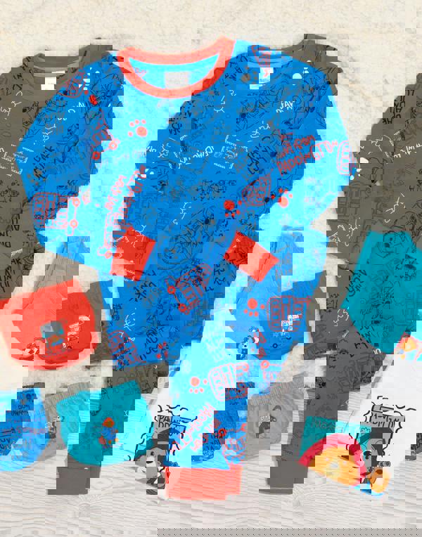 The set includes a blue t-shirt and legging pyjamas, two vests in white and blue, and three pairs of underwear pants