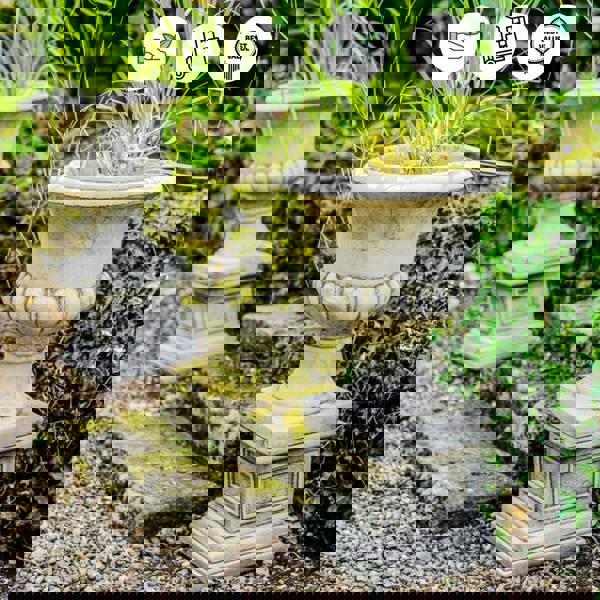 Medium Size stone cast garden vases with a wonderful detail will look fabulous at large backyards, patios or will enhance the display of the garden as driveway ornament. And they come with classy elegant columns for better display. A classic sophisticated design and genuine quality. With its stunning design, antique-look, intricate details, they are sure to bring elegance wherever it is placed. Heavy and solid, this will last a lifetime.