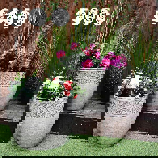 These gorgeously detailed pots are cast to a very high standard of strength, they are built to last. These wonderful pots have been designed in house with a unique lace design cast into the stone. This stunning pair of pots will certainly grab the attention of visitors in your garden or yard with the intricate detailing cast into the upper portion of the pot, complimenting the flowers you pot inside perfectly. Thess garden pots have drainage holes in the bottom. They are sure to bring elegance wherever it is placed!