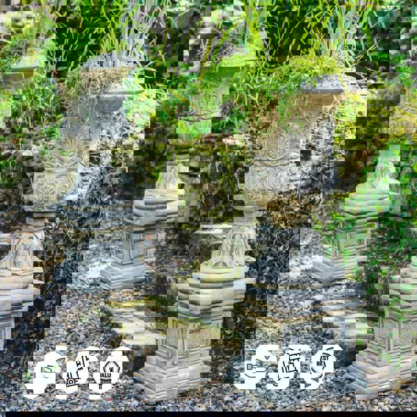 Large stone cast Victorian garden vases with a wonderful detail will look fabulous at large backyards, patios or will enhance the display of the garden as driveway ornament. A classic sophisticated design and genuine quality. With its stunning design, antique-look, intricate details, they are sure to bring elegance wherever it is placed. Pair of highly detailed elegant stone cast urns with plinths. Perfect for entrance ways, commercial premises, and gardens. This stunning set cannot fail to impress. A superb addition to your garden, great value set. Heavy and solid, this will last a lifetime.