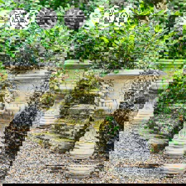 A beautiful pair of large, stunningly decorated stone cast garden urns with a classic lion head with Ring design and engraved details. Timeless sophistication and a real asset to any garden or patio. Very heavy and substantial, 88kg each, not to be confused with cheap, light weight designs.