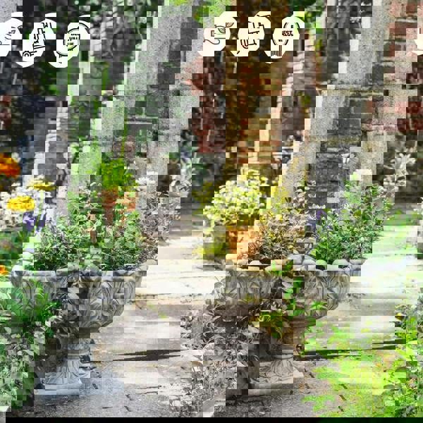 Large stone cast garden urn with a wonderful detail and shaped as blooming tulips will look great at large backyards, patios or will enhance the display of the garden as driveway ornament with or without a pillar. A beautiful design and genuine quality. With its stunning plant design design, antique-look, intricate details, they are sure to bring elegance wherever it is placed. Heavy and solid, this will last a lifetime.