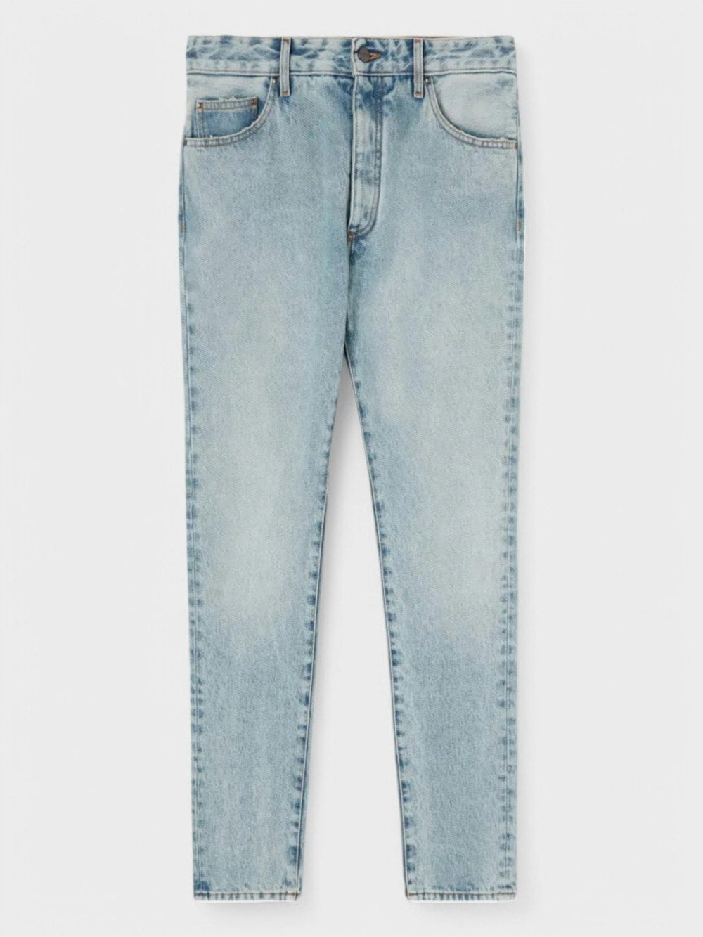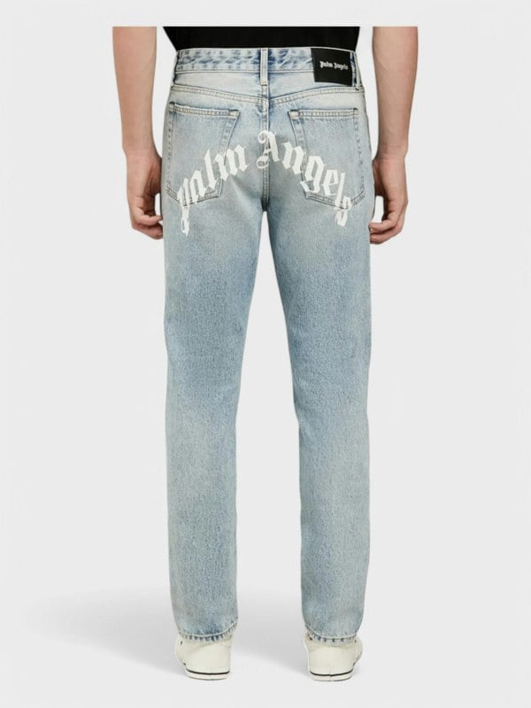 LONG DENIM PANTS IN LIGHT BLUE WASH. WHITE "PALM ANGELS" LOGO PRINTED AT BACK. BUTTON CLOSURE. ZIP FLY. BELT LOOPS.