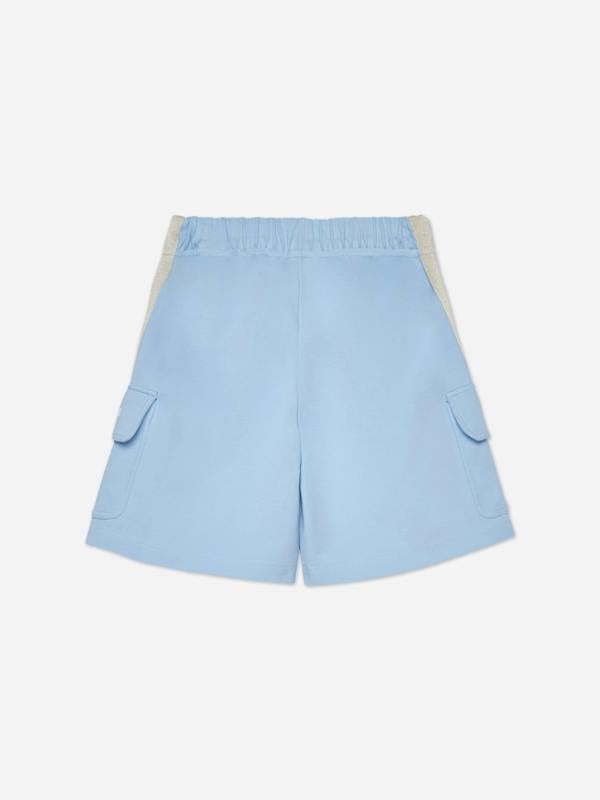 Streetwear codes meet bold branding in the Palm Angels Boys Track Cargo Shorts in Blue. Made in Italy, this baby blue pair is finished with Gothic Palm Angels lettering and tapes down the sides for a distinctive look. Cargo pockets add a practical touch, while the elasticated waist and elastic cuffs keep the silhouette neat and comfortable for everyday wear.