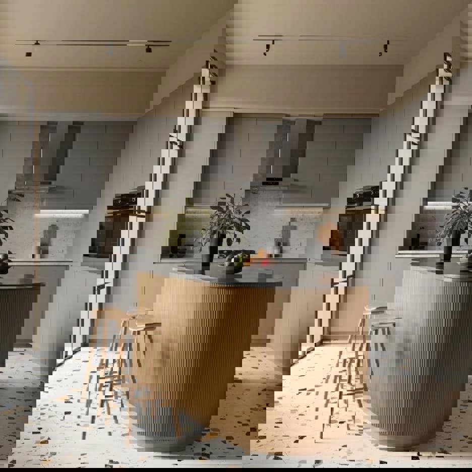 Modern kitchen with a wooden island and gray cabinets