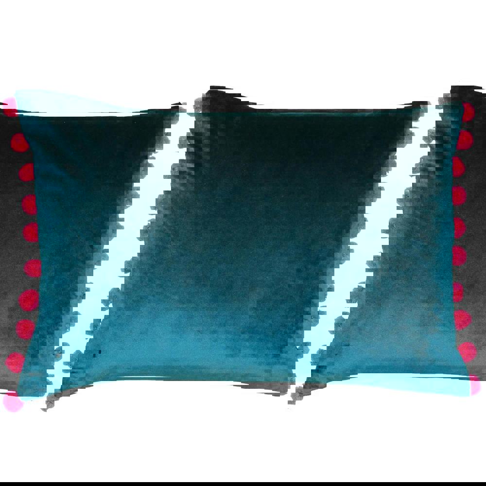 Finished with contrasting pom-pom trim around the edges, this cushion cover adds a playful, tactile detail that works well as a standout accent or layered with coordinating cushions. A hidden zip closure keeps the fastening discreet, so the focus stays on the design. Made from 100% polyester, it is described as hard-wearing and stain resistant, making it a practical choice for busy living spaces.