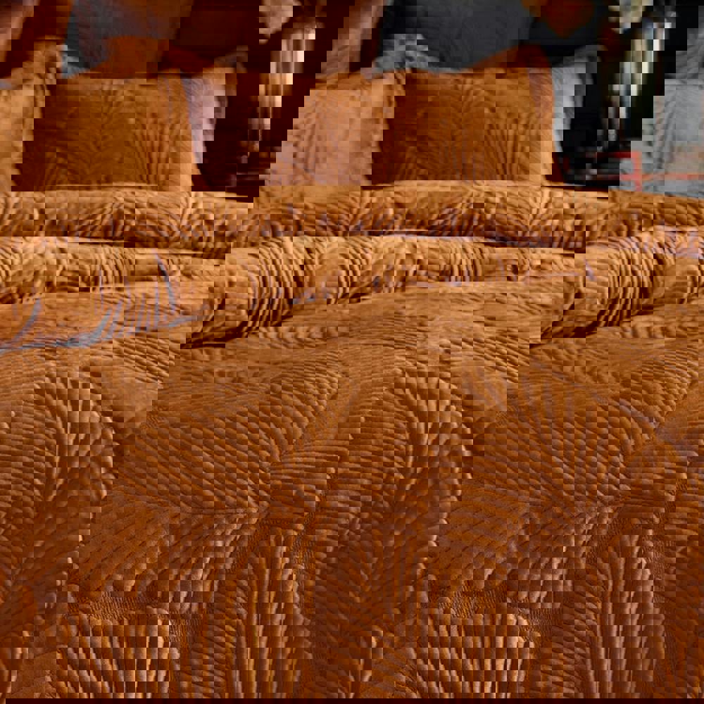 The Paoletti Palmeria Velvet Quilted Duvet Cover Set in rust is designed to dress your bed with a soft-touch, quilted finish and embroidered detailing. Made from a 50% polyester and 50% cotton blend, it offers a comfortable feel for everyday use.