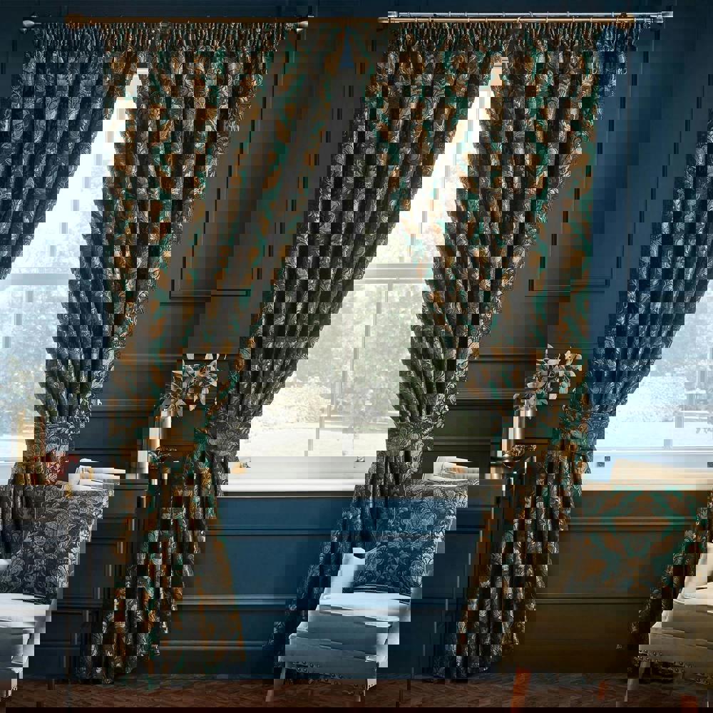 The Paoletti Shiraz Traditional Jacquard Pencil Pleat Curtains are designed to bring a classic look to your window dressing, with an all-over damask floral design and embroidered detailing. Finished in emerald, they offer a decorative focal point that suits traditional interiors as well as more contemporary spaces looking for a patterned accent.