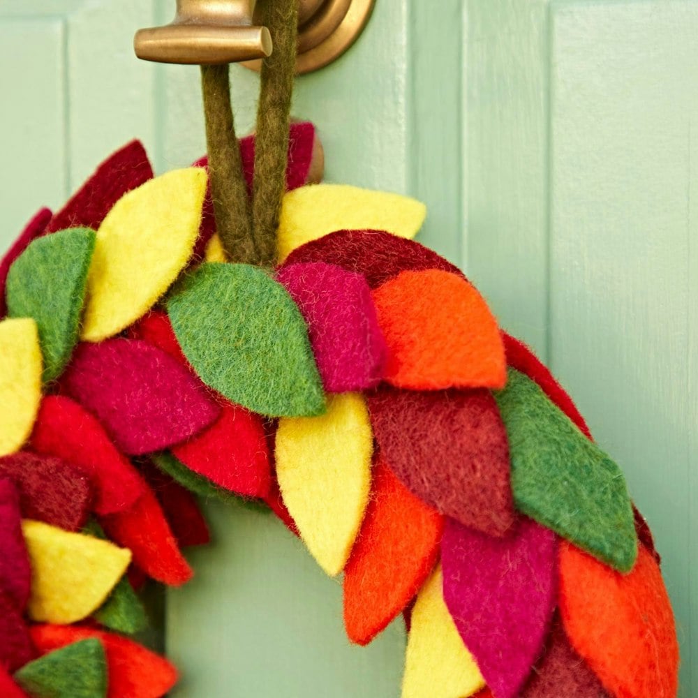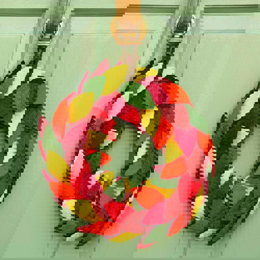 Bring joy and colour to your home with this handmade felt leaf wreath, designed with a vibrant rainbow of colours. Perfect for adding a cheerful touch to any space, this wreath is a celebration of colour and creativity that works beautifully year-round.