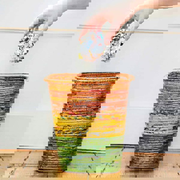 These handy baskets are ideal for waste paper or even storage in your home or office. The colourful striped design is hand crafted from recycled newspaper, making each one unique.