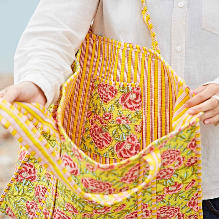 Lovingly handmade by skilled artisans in India, each tote is crafted from 100% natural cotton. Every bag is sewn in small batches, making each one truly one of a kind.