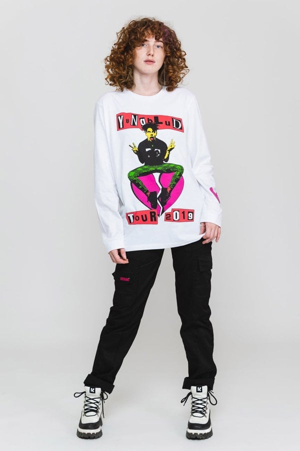 An official licensed Long Sleeved Tee featuring the Yungblud 'Tour' design motif. This high quality Long Sleeved Tee is available in a white colourway. Soft-style cotton fit tee featuring long sleeves and crew neck collar. Features back and sleeve printing. Comes in a wide range of sizes from Small through XX-Large, subject to availability.