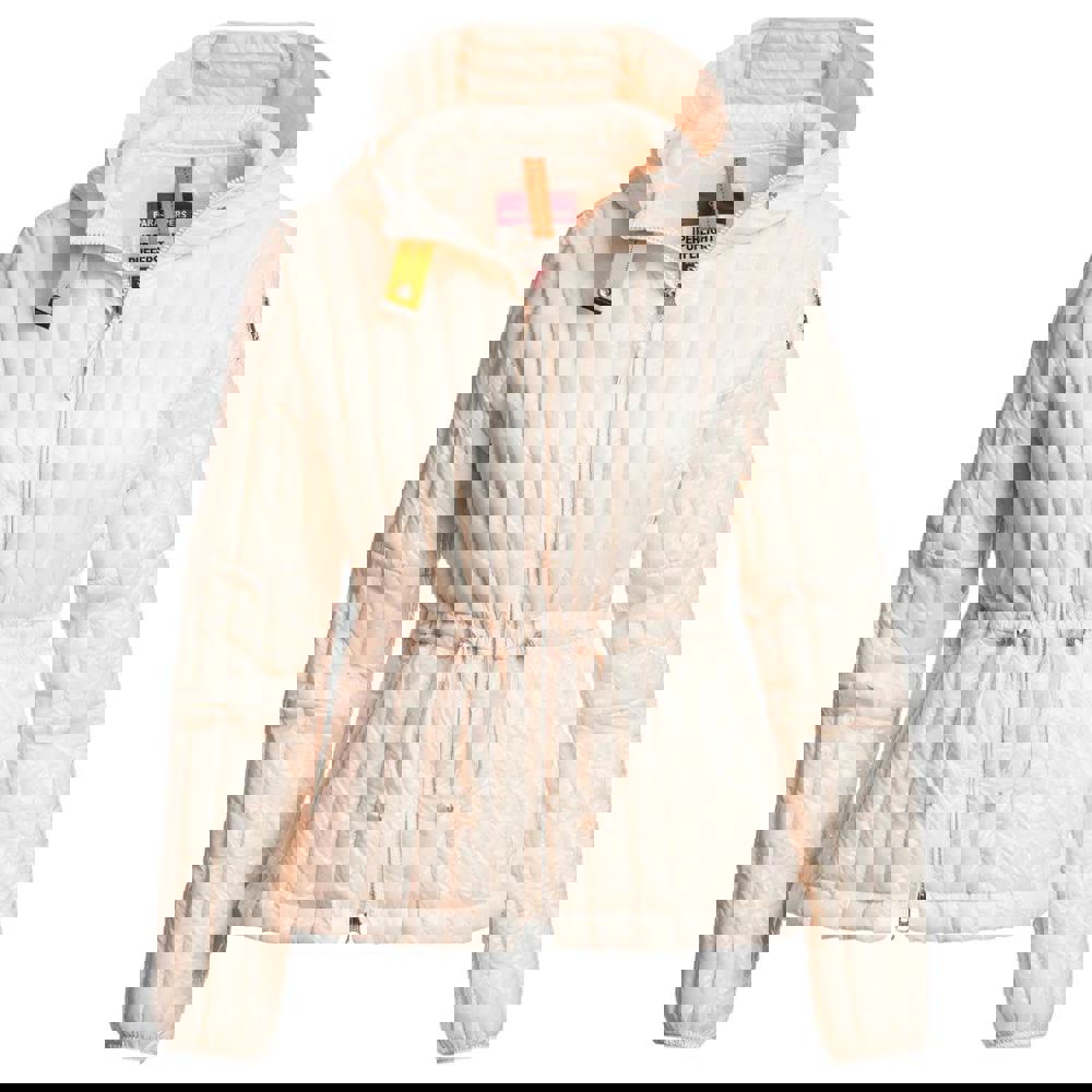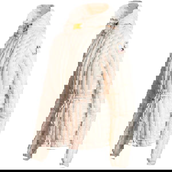 Down filling provides warmth without bulk, while the integrated hood adds extra coverage when the weather turns. The blush white colour keeps the look understated and easy to wear across a range of outfits, whether you are heading into the city or spending time outdoors.