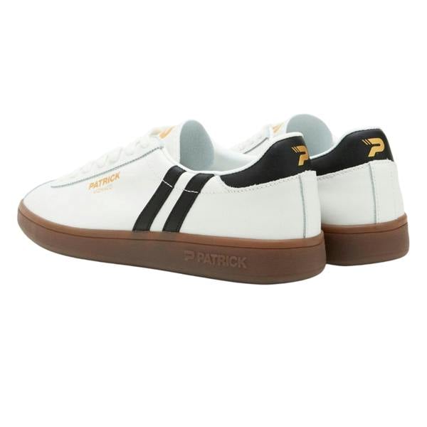 A round toe and lace-up fastening keep the silhouette traditional, while a suede panel and logo detailing add subtle brand character. The flat, rubberised cupsole construction completes the design in a crisp white, black and dark gum colourway.