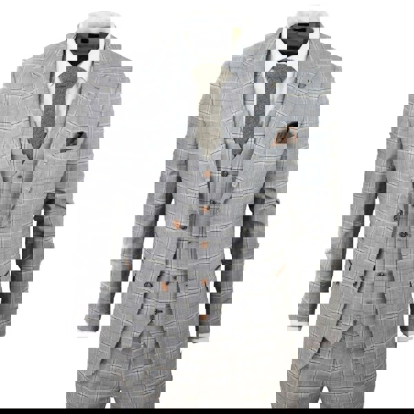 * The suit features a grey base with and brown check pattern, creating a stylish and sophisticated look.