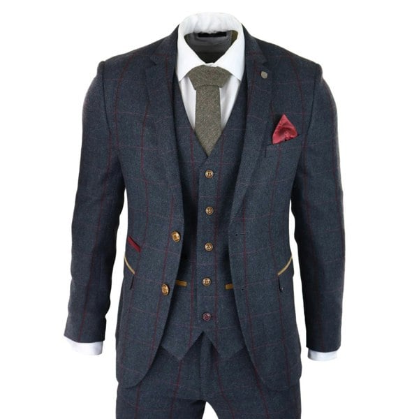 * Navy Blue Herringbone Tweed With Red Window Check Detailing, True 1920s Vintage Fashion With A Modern Twist