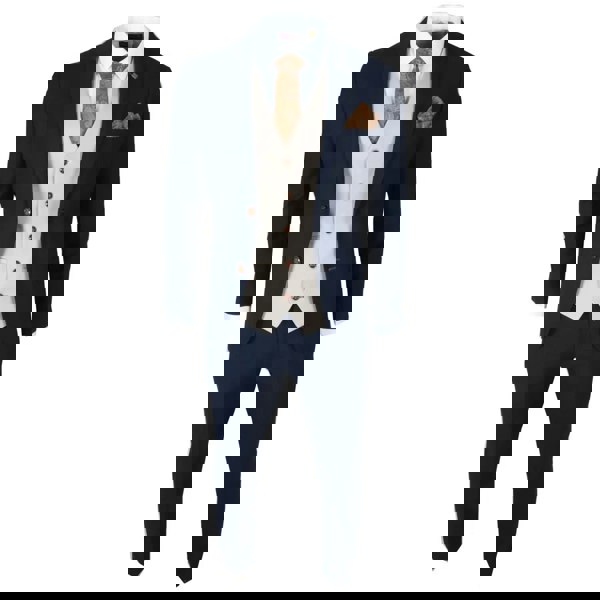 * Contrasting Cream Waistcoat: The cream waistcoat provides a sophisticated contrast to the navy suit, making it a standout choice for weddings and formal occasions