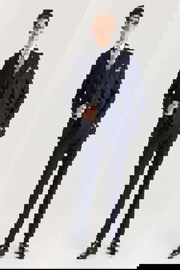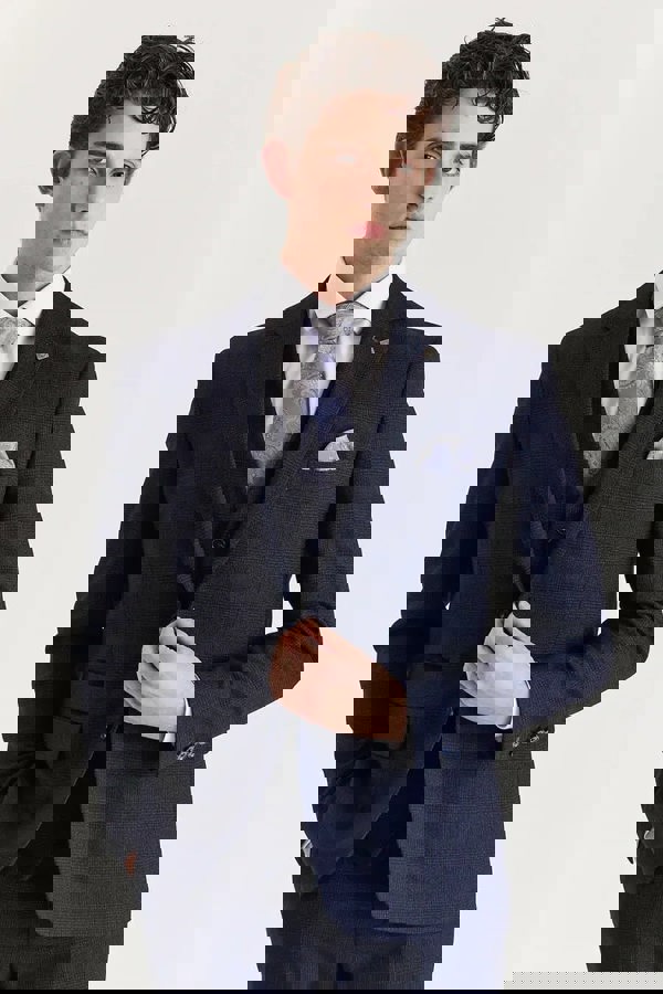 * Prince of Wales Check Pattern: Showcasing a distinguished Prince of Wales check in navy blue, this suit blends classic style with modern appeal, ideal for weddings, proms, and professional events
