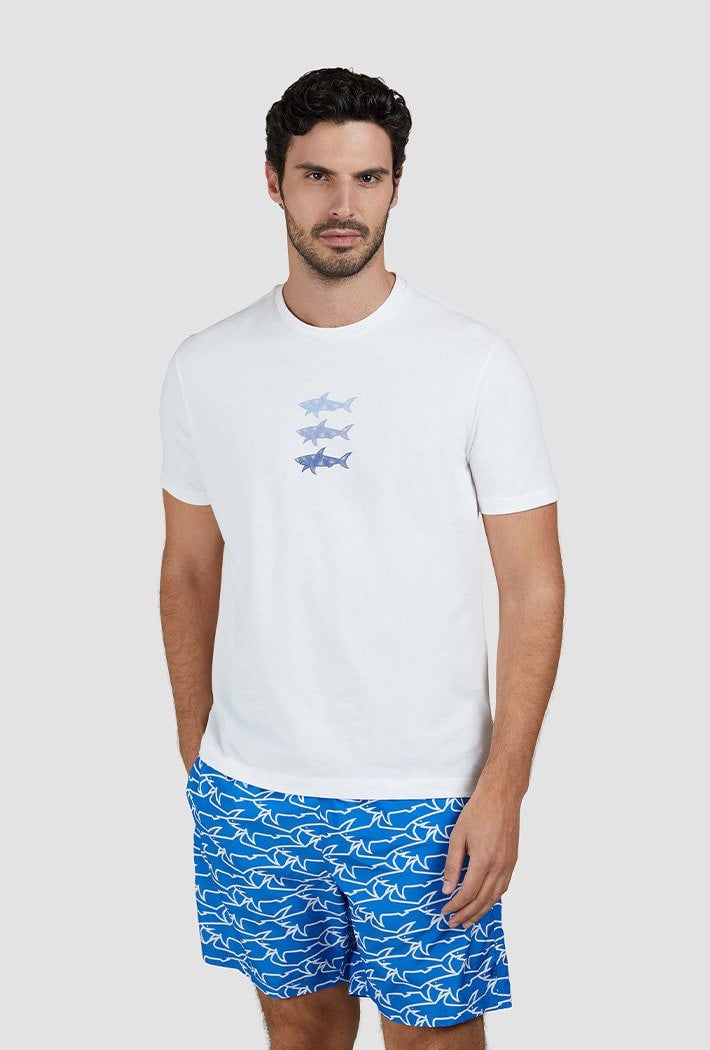Made from cotton jersey that’s naturally breathable and feels super-soft against the skin, its regular-fit crew-neck silhouette is embellished with our signature shark print in the colours of the ocean.