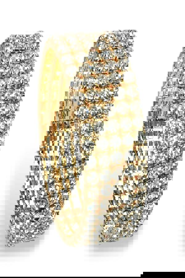 Our stretch diamante bracelet has an elasticated band to stretch over the hand. It has diamantes all the way round which means it never needs to be swivelled round! Perfect for that special occasion! Inner circle Diameter = 2" (5cms)Stretching to 3. 5" (9cms).