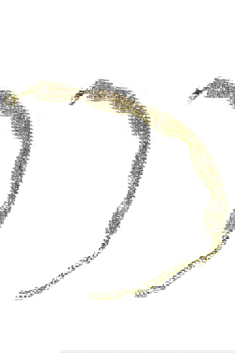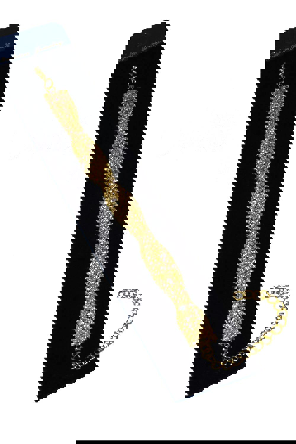 The diamante stones are clear, and sparkle in light and with movement. There are 5 rows of rhinestone diamantes that are held together and arranged in a twisted layered formation. This ladies versatile bracelet is nickel free to prevent discolouration of the skin. This is a hard but flexible soft bracelet meaning that it elegantly drapes across the wrist. This sparkly bracelet clasps together with a lobster claw spring hook which so the length is adjustable to fit your unique wrist size. This statement bracelet has a full length measuring 9" (23cms).