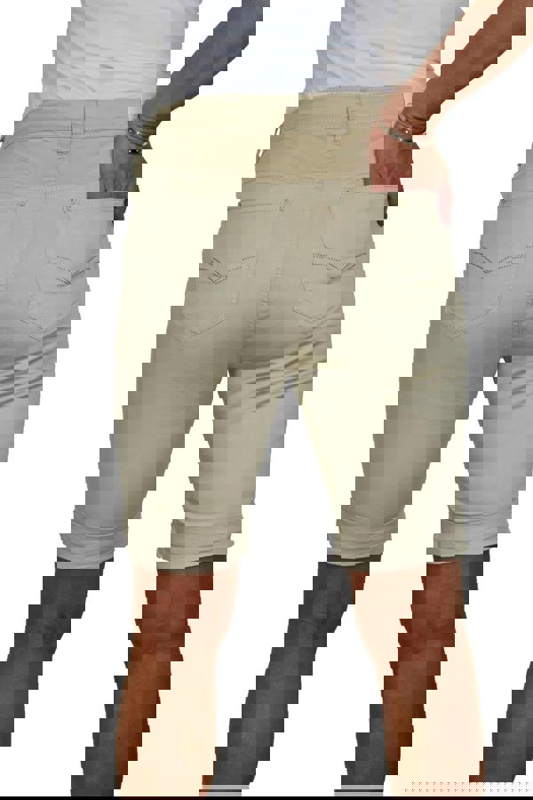 These are chino jean style shorts designed to hug your curves in all the right places. The fabric has a generous stretch with a slight sheen to make them super comfortable to wear throughout the day. They are a fashionable mid waist, regular fit pair of Chino Bermuda shorts. To simply fasten the jean shorts, there is a self-colour metal stud button and a zip fly to finish. These above the knee shorts have an inside leg measuring 9" - 10" (23cms – 25cms) that fall above the knee. The turned up hem is stitched in place.