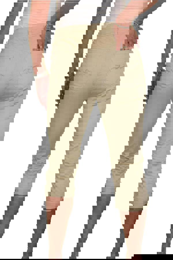 Our cropped chinos are ideal for the cooler summer evenings and build up to summer. The fabric has a slight sheen and is stretchy to make them super comfortable to wear throughout the day! These ladies capri’s are a fitted cut on the hips and have a high rise. To simply fasten the jean shorts, there is a self-colour metal stud button and a zip fly to finish. The bottoms of each leg have a turn up cuff for a stylish look and rest below the knee with an inside leg measuring 17" (44cms).