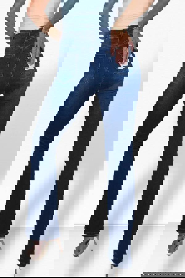 These ladies’ flared leg denim jeans are designed with a flattering high-waisted fit and a vintage-inspired finish. Featuring a stylish mid to dark blue wash with faded legs, they offer a timeless look with modern comfort. Crafted from super stretchy denim, they’re perfect for all-day wear and easy to style for any occasion, whether dressed up with heels or kept casual with trainers.